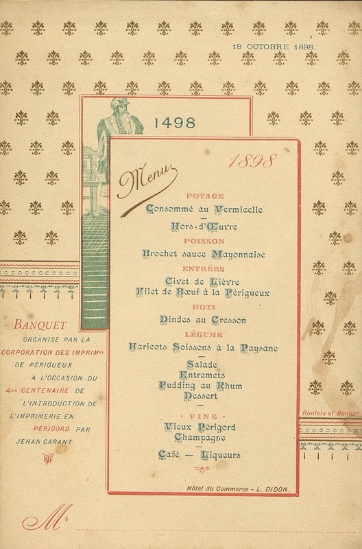 Banquet organisé par la corporation des imprimeurs de Périgueux, à l'occasion du 4e centenaire de l'introduction de l'imprimerie en Périgord par Jehan Carant.