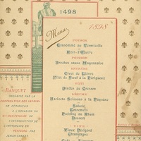 Menu illustré par un jeu de perspectives d'impressions décoratives : un semis de fleurs de lys dorées séparé du texte par un ruban bleu et rouge en décalage recouvert d'un iconographie de Gutenberg devant sa presse en 1498 couleur sinople, le tout recouvert par par le menu de 1898.