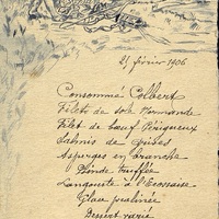 Menu : Consommé Colbert. Filet de sole Normande. Filet de bœuf Périgueux. Salmis de grives. Asperges en branches. Dinde truffée. Langouste à l’Écossaise. Glace pralinée. Dessert varié