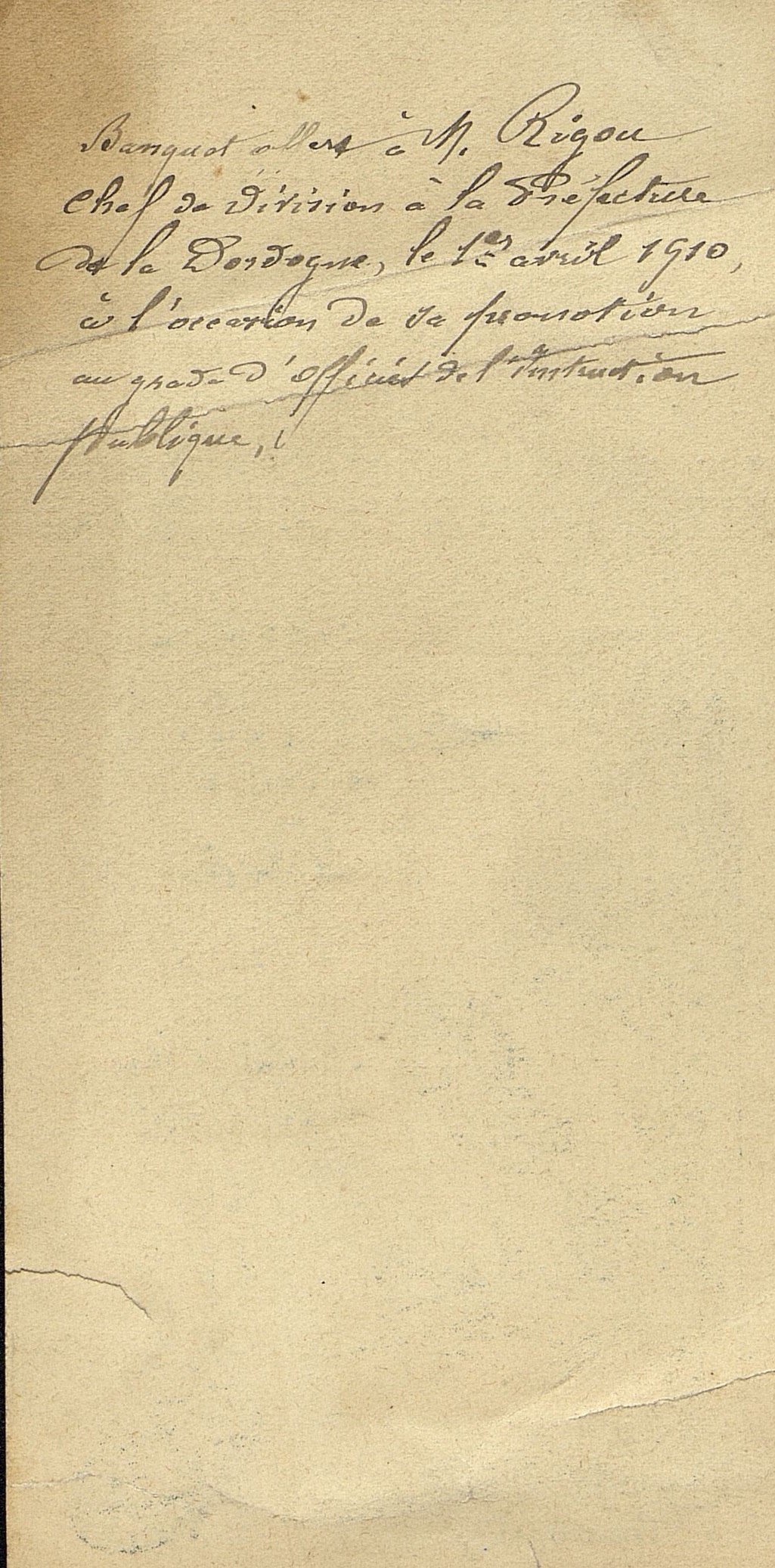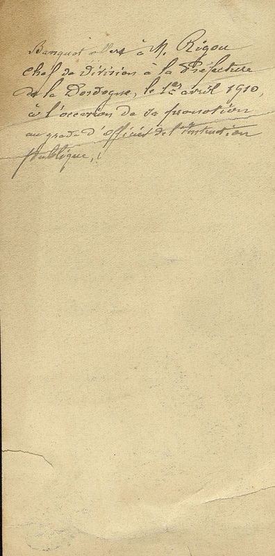 Au verso du menu écriture manuscrite : Banquet offert à M Rigou chef de division à la préfecture de la Dordogne le 1er avril 1910 à l'occasion de sa promotion au grade d'officier de l'instruction publique.