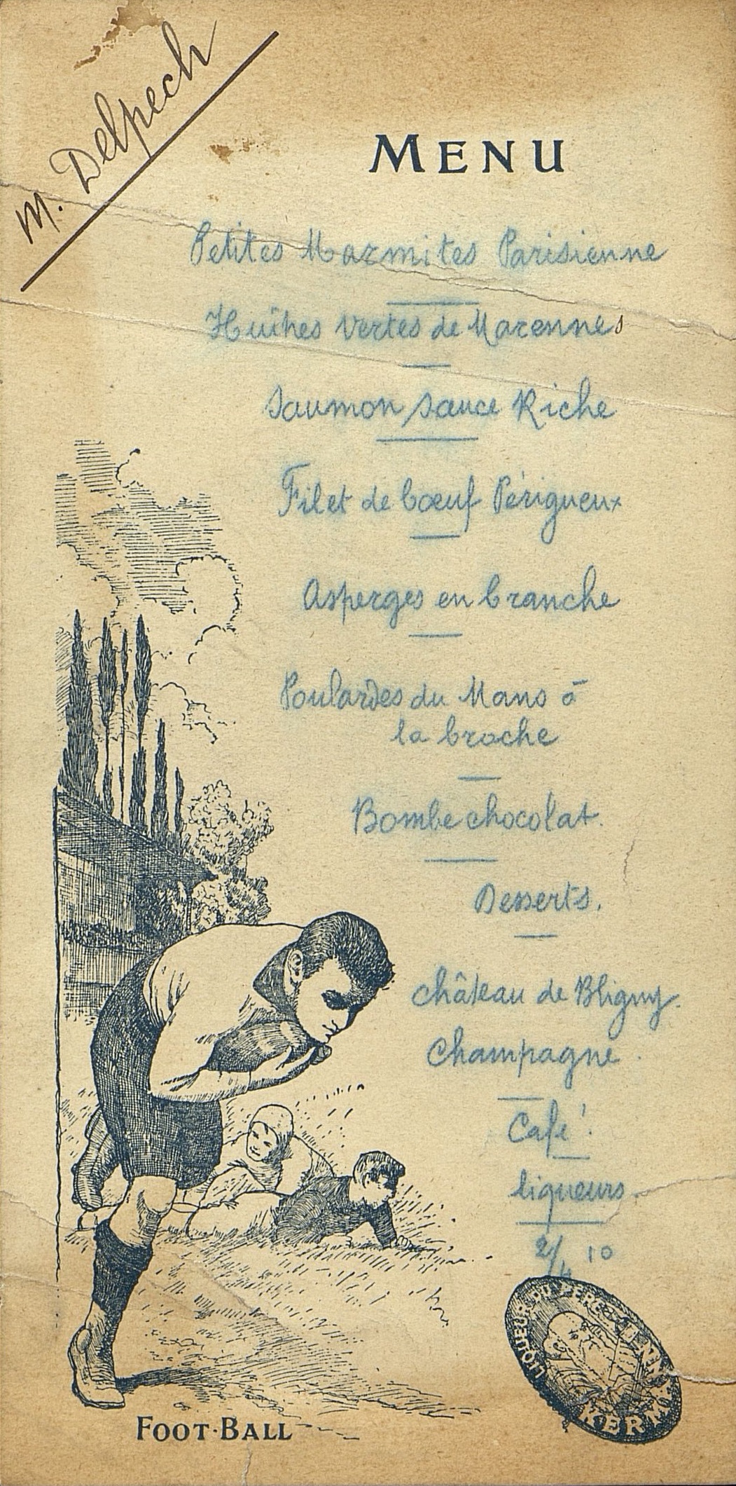 Menu publicitaire avec le macaron de la liqueur du Pére Kermann. Illustration par un dessin de joueur de rugby sous-titré "Foot-Ball" . Menu attribué à M. Delpech .