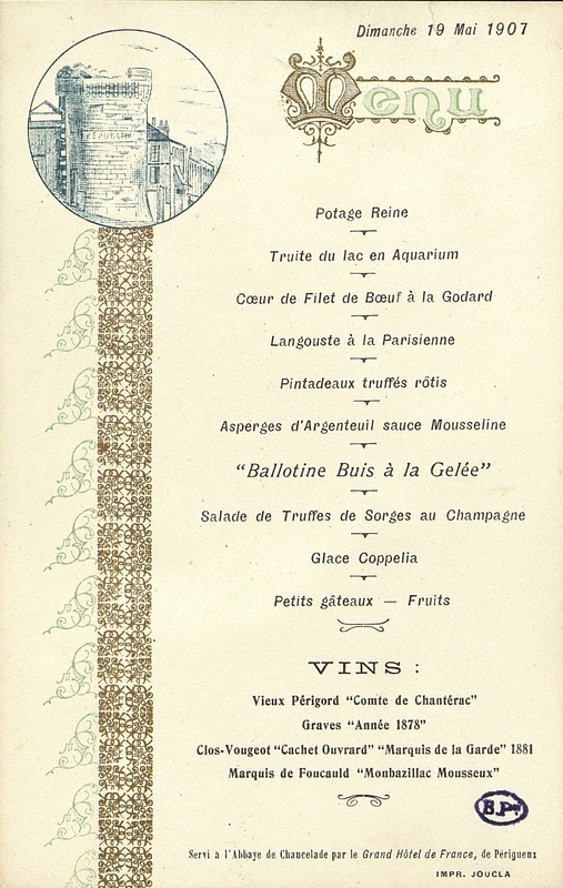 Servi à l'abbaye de Chancelade par le grand Hôtel de France, de Périgueux.