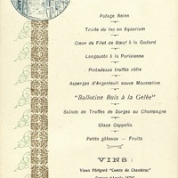 Menu : Potage Reine. Truite du lac en Aquarium. Cœur de filet de bœuf à la Godard. Langouste à la Parisienne. Pintadeaux truffés rôtis. Asperges d'Argenteuil sauce mousseline. Ballotine Buis à la gelée. Salade de truffes de Sorges au champagne. Glace. Coppelia. Petits gâteaux. Fruits.
