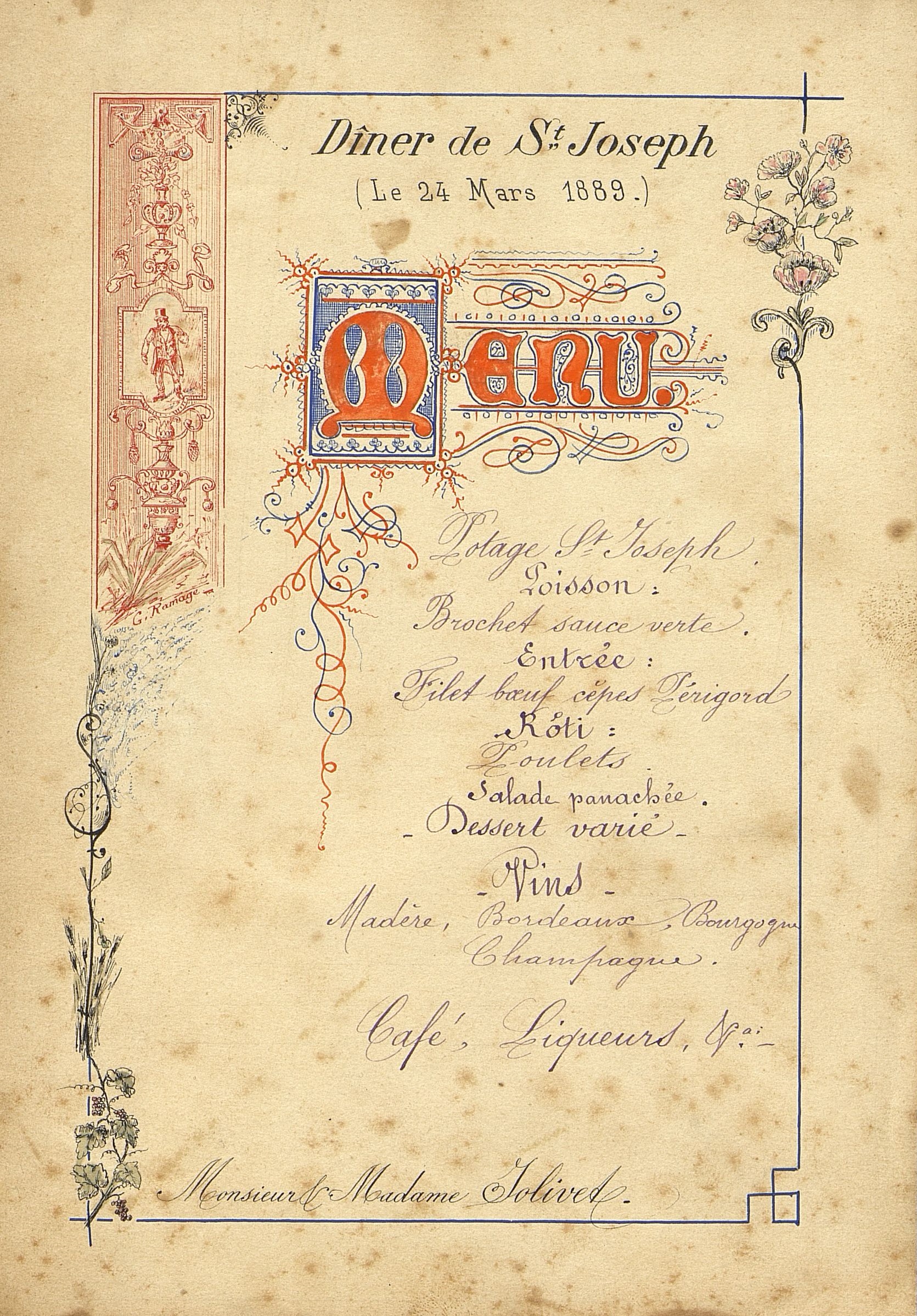 Menu : Potage St Joseph. Poisson : Brochet sauce verte. Entrée : Filet de bœuf cèpes Périgord. Rôti : poulets. Salade panachée : Dessert varié. Vins : Madère, Bordeaux, Bourgogne. Champagne