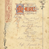 Menu manuscrit et imprimé adressé à M. et Mme Jolivet. illustration en marge à gauche de G. Ramage avec un homme en costume du 19ème siècle, costume à jaquette et chapeau haut-de-forme légèrement déhanché dans un encadrement en guirlande haute et basse supportée par un liseré bleu d'encadrement support de vigne et de gerbe de blé, terminé par un bouquet de fleurs d'églantier. Titre du menu en capitales gothiques rouges sur cartel orné bleu et rouge avec entrelacs rouges et bleus .