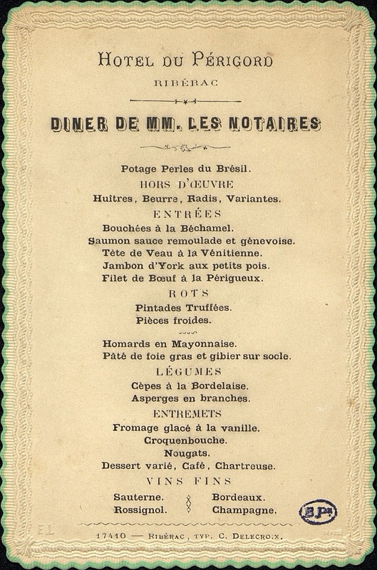 Boissons : Café, Chartreuse. Vins fins : Sauterne, Rossignol, Bordeaux, Champagne.