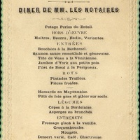 Plats servis : Potage Perles du Brésil. Hors-d’œuvre : Huîtres, Beurre, Radis, Variantes. Bouchées à la Béchamel. Saumon sauce rémoulade et genevoise. Tête de Veau à la Vénitienne. Jambon d'York aux petits pois. Filets de Bœuf à la Périgueux.