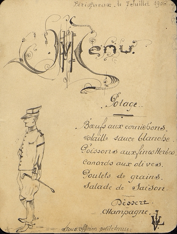 Menu militaire. Menu manuscrit et dessiné à la main avec le personnage d'un officier avec sa cravache sous-titré : Sous-officier petite tenue. Monogramme V. L. et Initiale Menu entrelacs V et L.