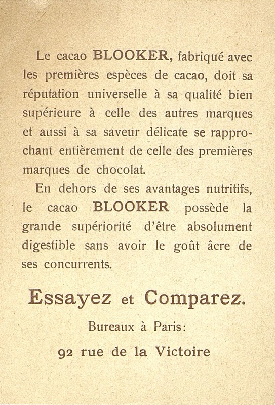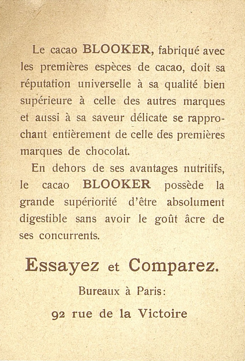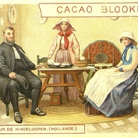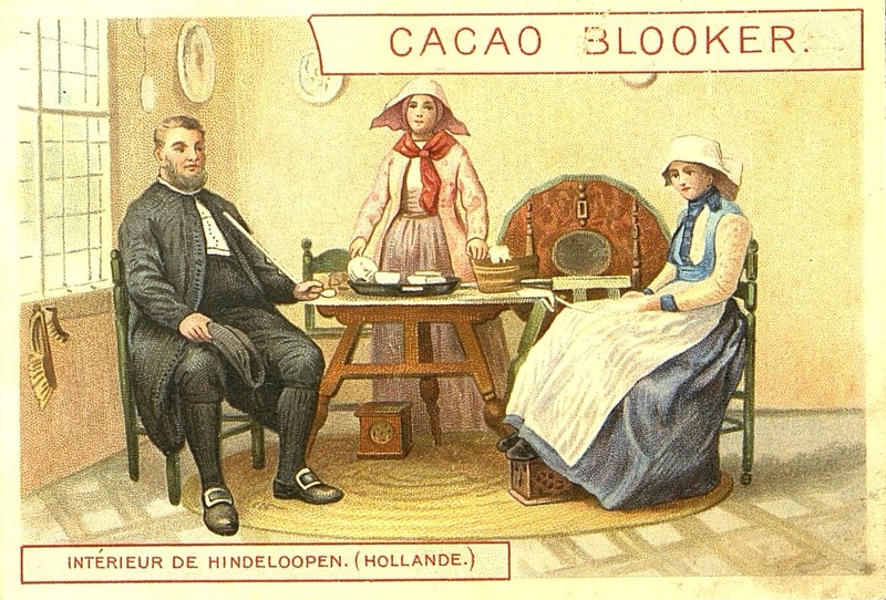 - Carte illustrée d'un intérieur de Hindeloopen (Hollande). Au dos, un texte de présentation du cacao Blooker. Chromolithographie. Vignette commerciale.