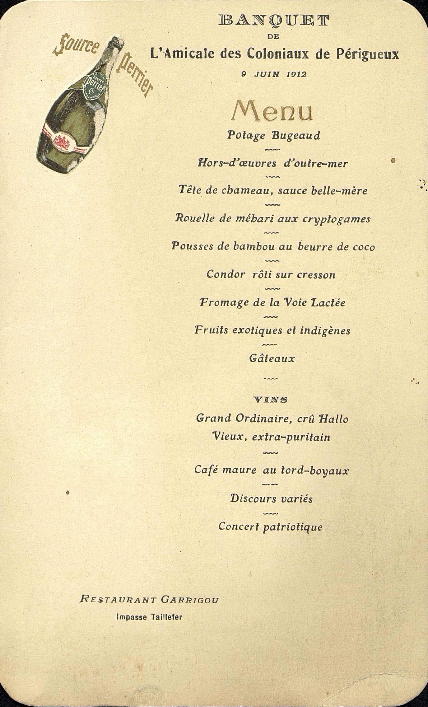 Menu avec publicité pour la petite bouteille Perrier. Restaurant Garrigou, Impasse Taillefer.