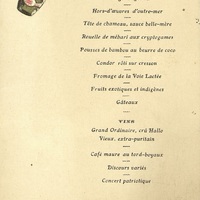 Boissons : Vins : Grand Ordinaire. Crû Hallo. Vieux. Extra-puritain. Café maure au tord-boyaux. Discours variés. Concert patriotique.
