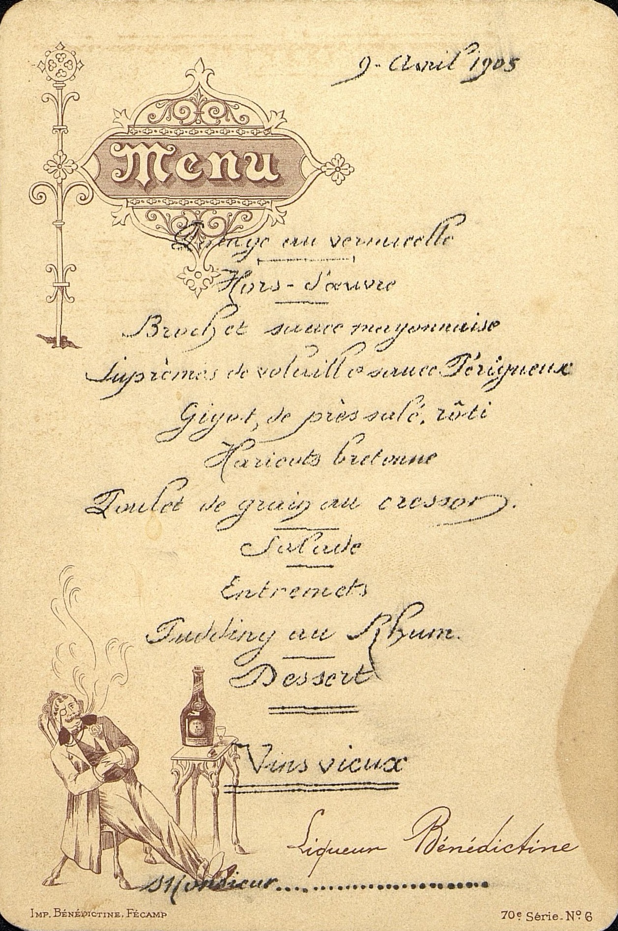Menu publicitaire pour la liqueur "La Bénédictine" daté du 6 avril 1905. Écriture manuscrite. Le nom du dédicataire n'est pas attribué.