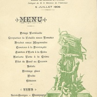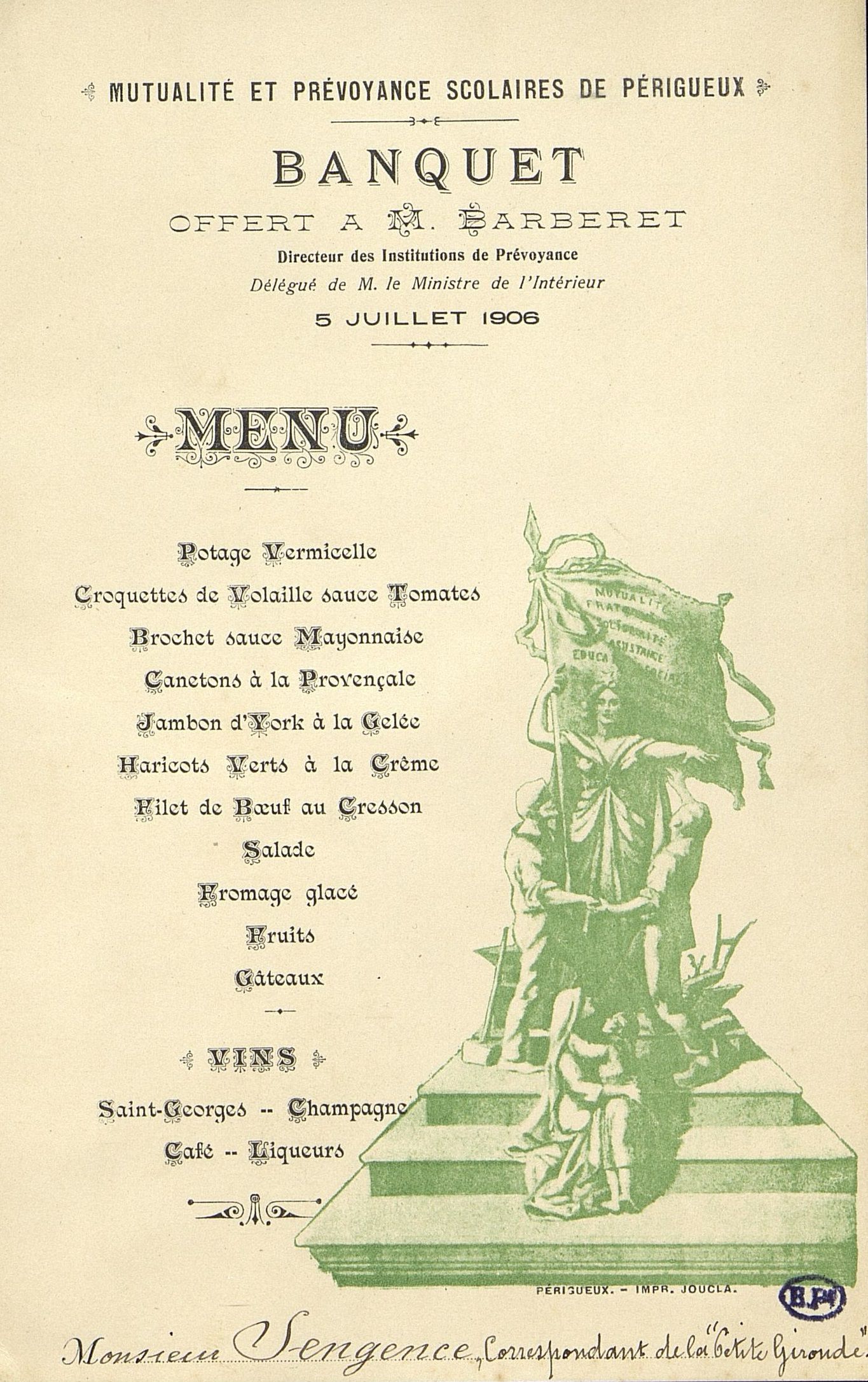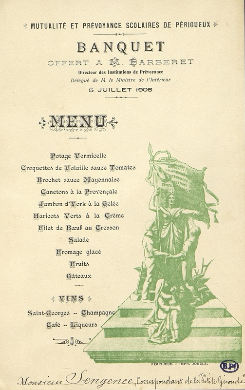 Banquet de la Mutualité et prévoyance scolaires de Périgueux, offert à M. Barberet, Directeur des Institutions de Prévoyance en date du 5 juillet 1906. En bas du menu en manuscrit : Monsieur Sengence, Correspondant de la "Petite Gironde". Illustration allégorique.