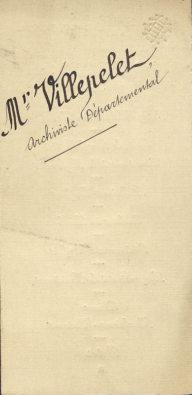 Menu à monogramme daté du 25 août 1904. Au verso mention manuscrite : Mr Villepelet Archiviste Départemental. Monogramme E. dans H.