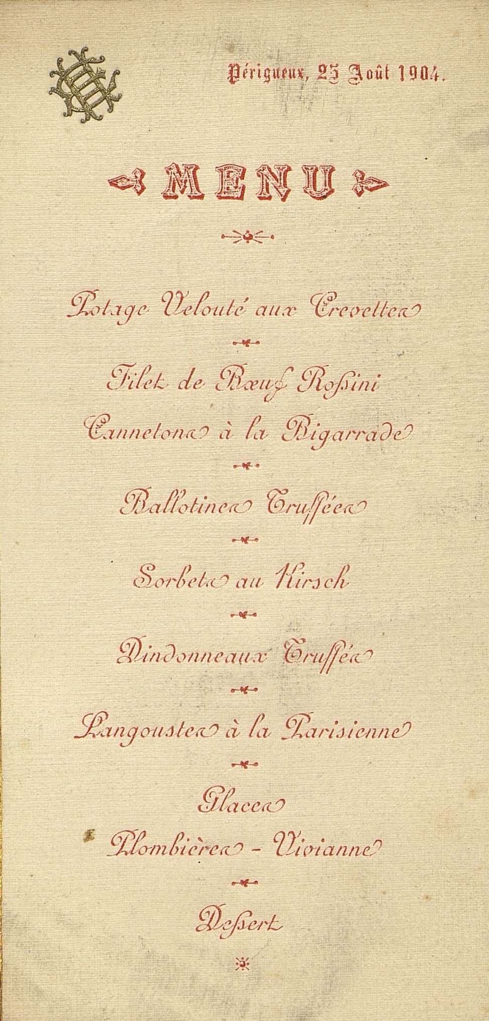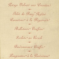Cannetons à la Bigarrade [orange amère]. Ballotines Truffées. Sorbets au Kirsch. Dindonneaux Truffés. Langouste à la Parisienne. Glaces Plombières et Viviannes. Dessert.