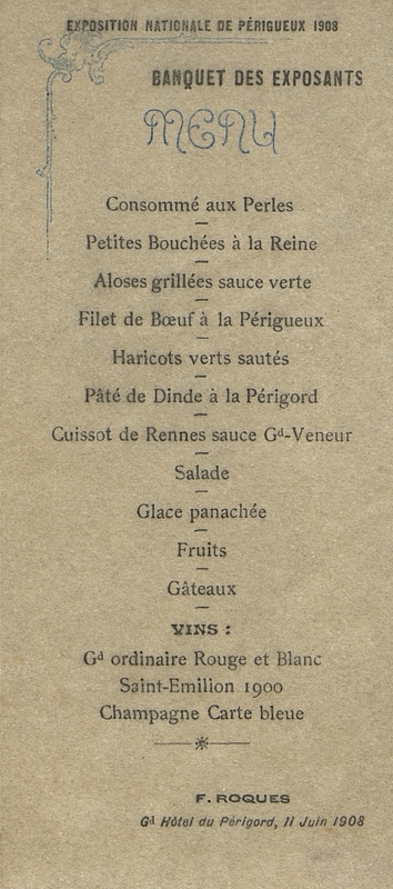 Menu de l'Exposition Nationale de Périgueux 1908.