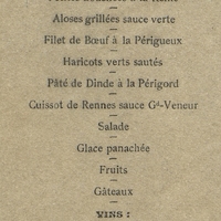 Consommé aux perles ; Petites Bouchées à la Reine ; Aloses grillées sauce Verte ; Filet de Bœuf à la Périgueux ; Haricots verts sautés ; Pâtés de Dinde à la Périgord ; Cuissot de Rennes sauce Grand-Veneur ; Salade, Glace panachée ; Fruits ; Gâteaux.