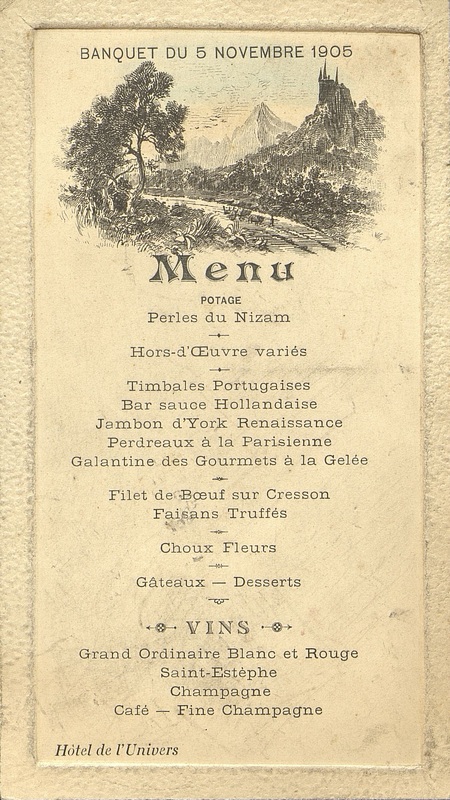 Plats servis : Potage. Perles du Nizam. Hors-d’œuvre variés. Timbales Portugaises. Bar sauce Hollandaise. Jambon d' York. Renaissance. Perdreaux à la parisienne. Galantine des Gourmets à la Gelée. Filet de Bœuf sur Cresson. Faisans Truffés. Choux-Fleurs. Gâteaux-Desserts.