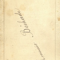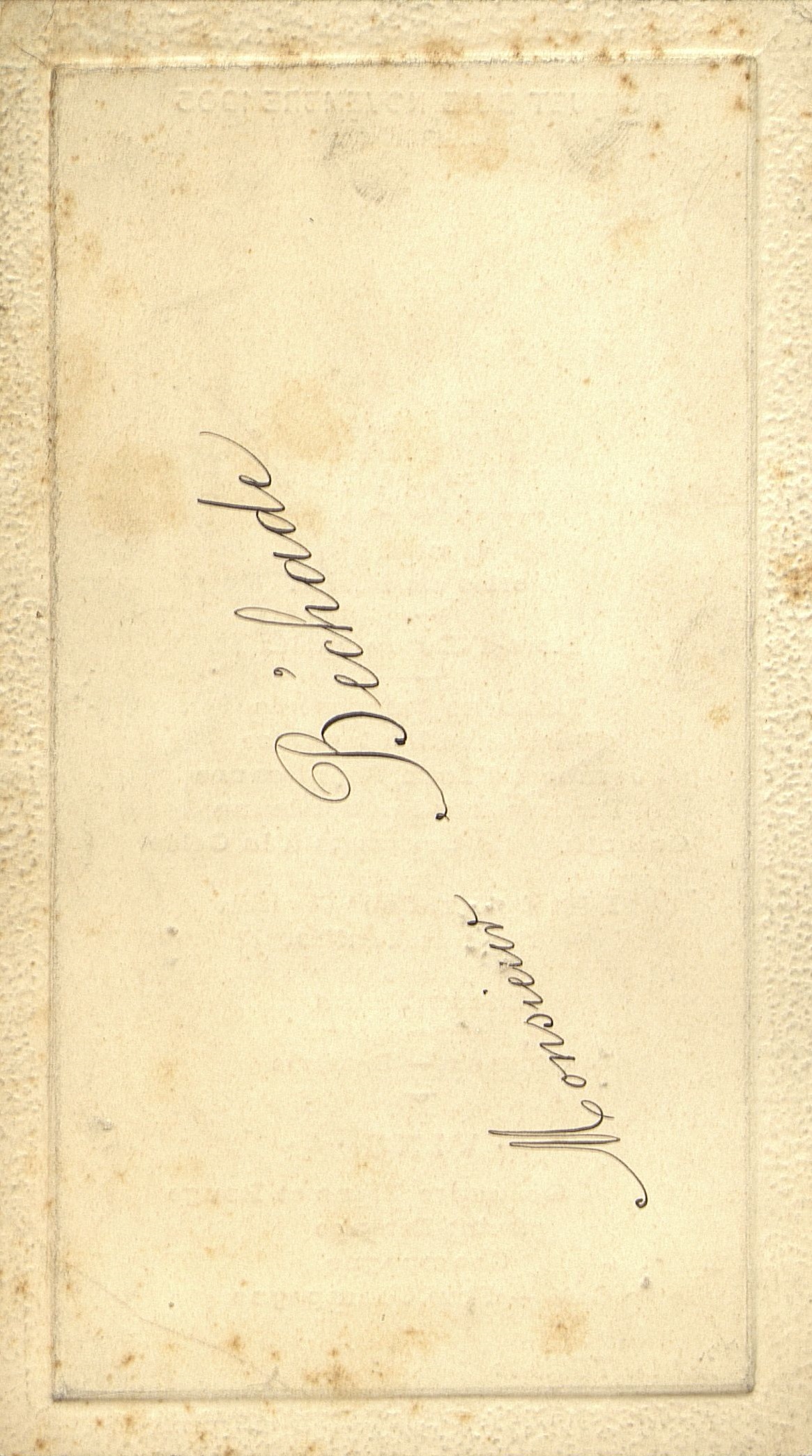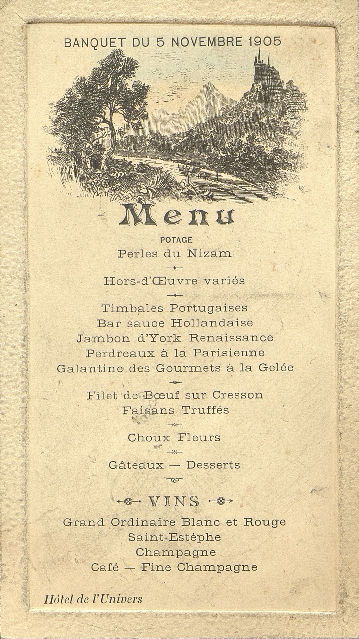 Menu du Banquet du 5 novembre 1905. Illustré d'un paysage de montagne avec château romantique. Cadre de bordure carton martelé de menu en cuvette. Au verso : mention manuscrite : Monsieur Béchade.