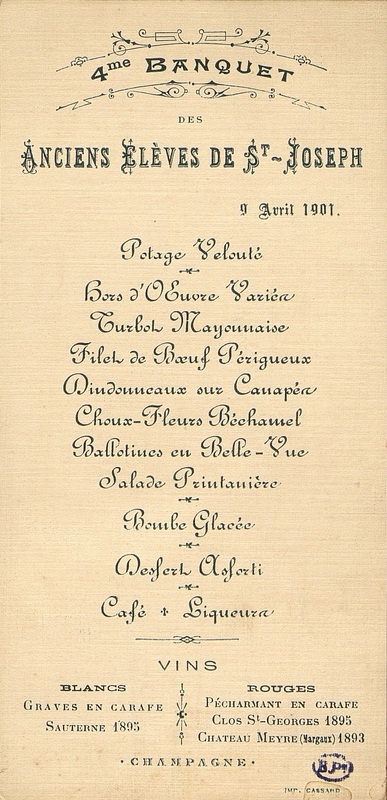 Menu du 4e Banquet des Anciens Elèves de Saint-Joseph en date du 9 avril 1901.