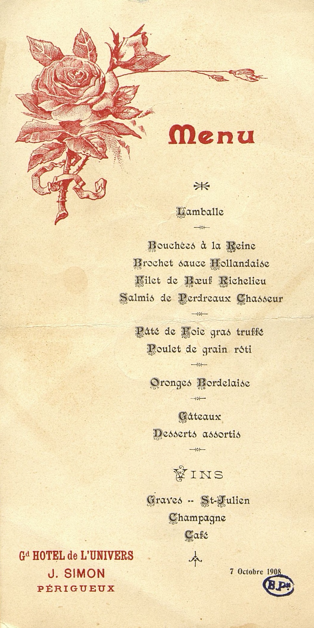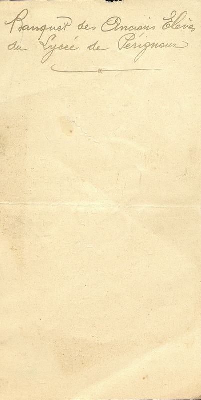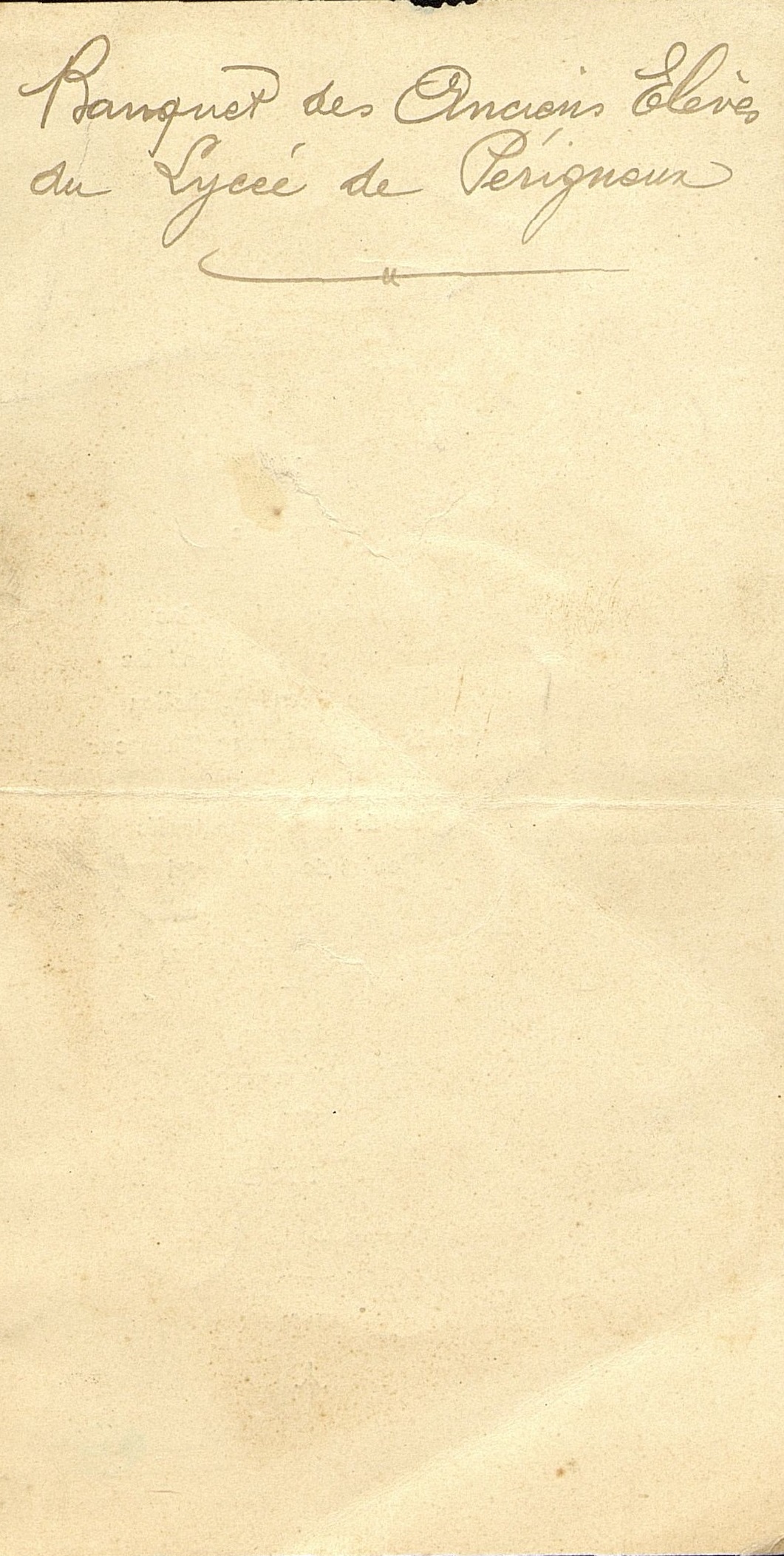 Menu du 7 octobre 1908 des anciens élèves du lycée de Périgueux.