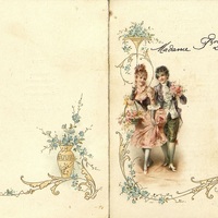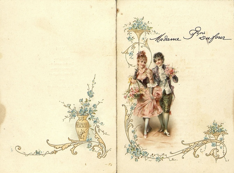 Menu dépliant adressé à Mme François Dufour. Illustrations au recto : deux jeunes personnes en habits d' époque Louis XV avec des bouquets de fleurs encadrés de coupes et de rinceaux d'aubépines bleutées . Au verso un vase d'inspiration grecque rempli de tiges fleurs d'aubépine .