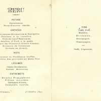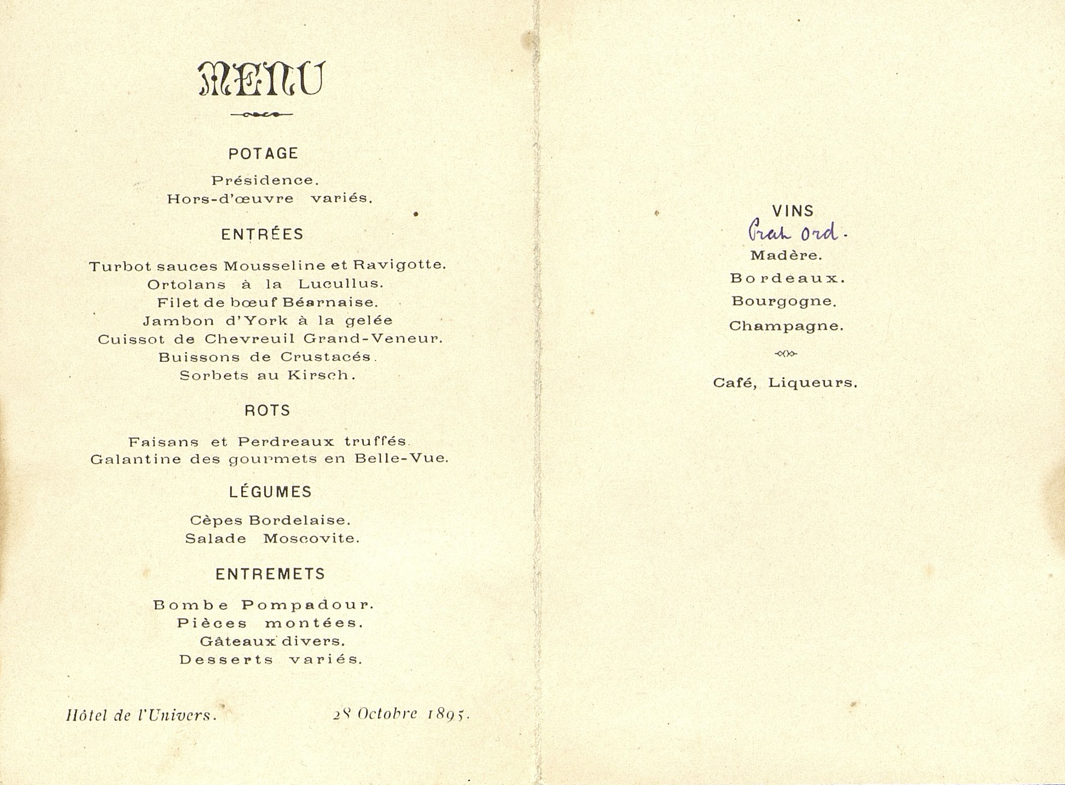 Plats servis : Potage : Présidence. Hors d’œuvre variés. Entrées : Turbot sauces Mousseline et Ravigote. Ortolans à la Lucullus. Filet de Bœuf Béarnaise. Jambon d' York à la gelée. Cuissot de Chevreuil Grand-Veneur. Buissons de Crustacés. Sorbets au Kirsch. Rots : Faisans et Perdreaux truffés. Galantine des gourmets en Belle-Vue. Légumes : Cèpes Bordelaise. Salade Moscovite. Entremets : Bombe Pompadour. Pièces montées. Gâteaux divers. Desserts variés.