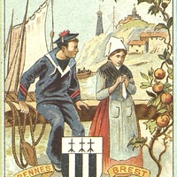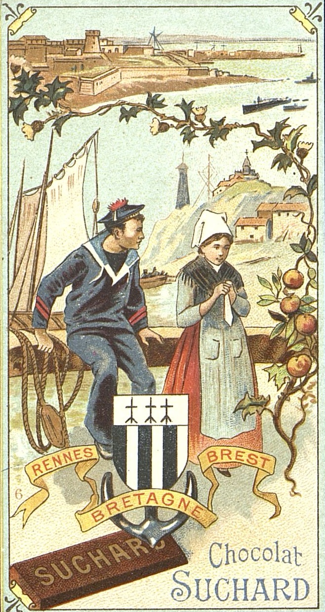 - Carte publicitaire illustrée par une scène de bretons du Finistère. Vignette commerciale. Chromolithographie. Armes anciennes de Rennes : « Palé de sable et de d'argent de six pièces, au chef d’argent chargé de trois mouchetures d’hermine de sable. » Barre de chocolat.