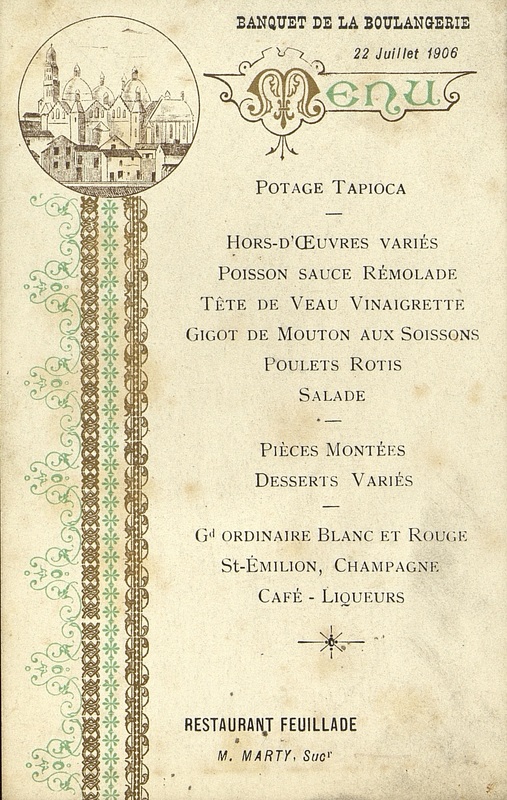 Menu du Banquet de la Boulangerie à Périgueux illustré avec une image en médaillon de la Cathédrale Saint-Front enrichi d'un ruban festonné or et sinople descendant . Attribué à M. Sengence.