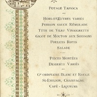 Plats servis : Potage Tapioca. Hors d’œuvres variés. Poisson sauce Rémoulade. Tête de Veau Vinaigrette. Gigot de moutons aux Soissons. poulets Rôtis. Salade. Pièces montées. Dessert variés.
