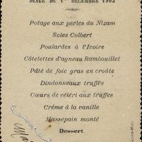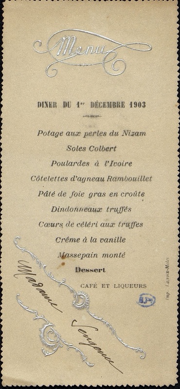 Plats servis : Potage aux perles du Nizam. Soles Colbert. Poulardes à l' Ivoire. Côtelettes d'agneau Rambouillet. Pâté de Foie gras en croûte. Dindonneaux truffés. Cœur de céleri aux truffes. Crème à la Vanille. Massepain monté. Dessert.