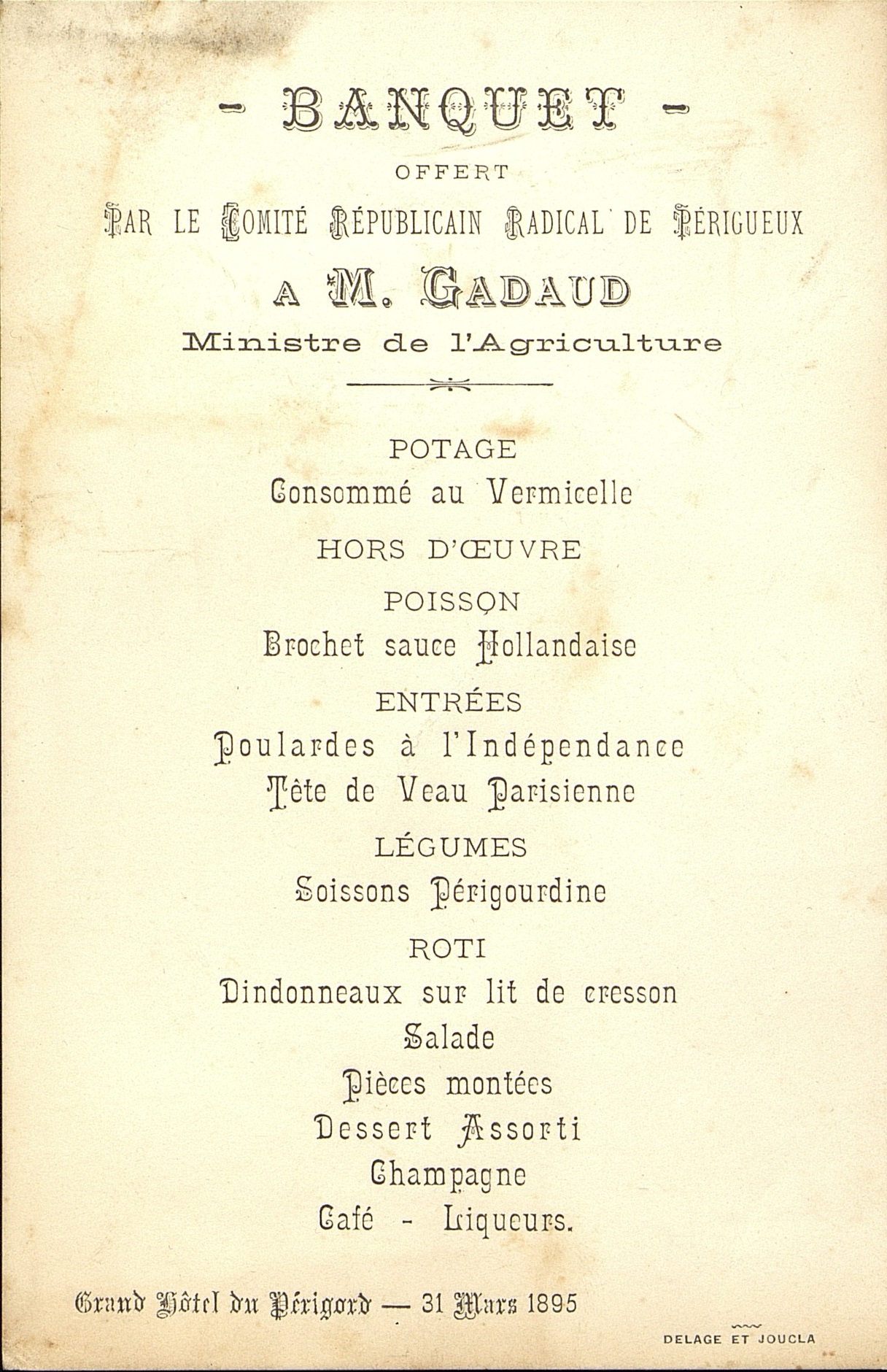 Plats servis : Consommé au Vermicelle. Hors d’œuvre. Poisson : Brochet sauce Hollandaise. Entrée : Poulardes à l'Indépendance. Tête de veau Parisienne. Légumes : Soissons Périgourdine. Rôti : Dindonneaux sur lit de Cresson. Salade. Pièces montées. Dessert assorti.
