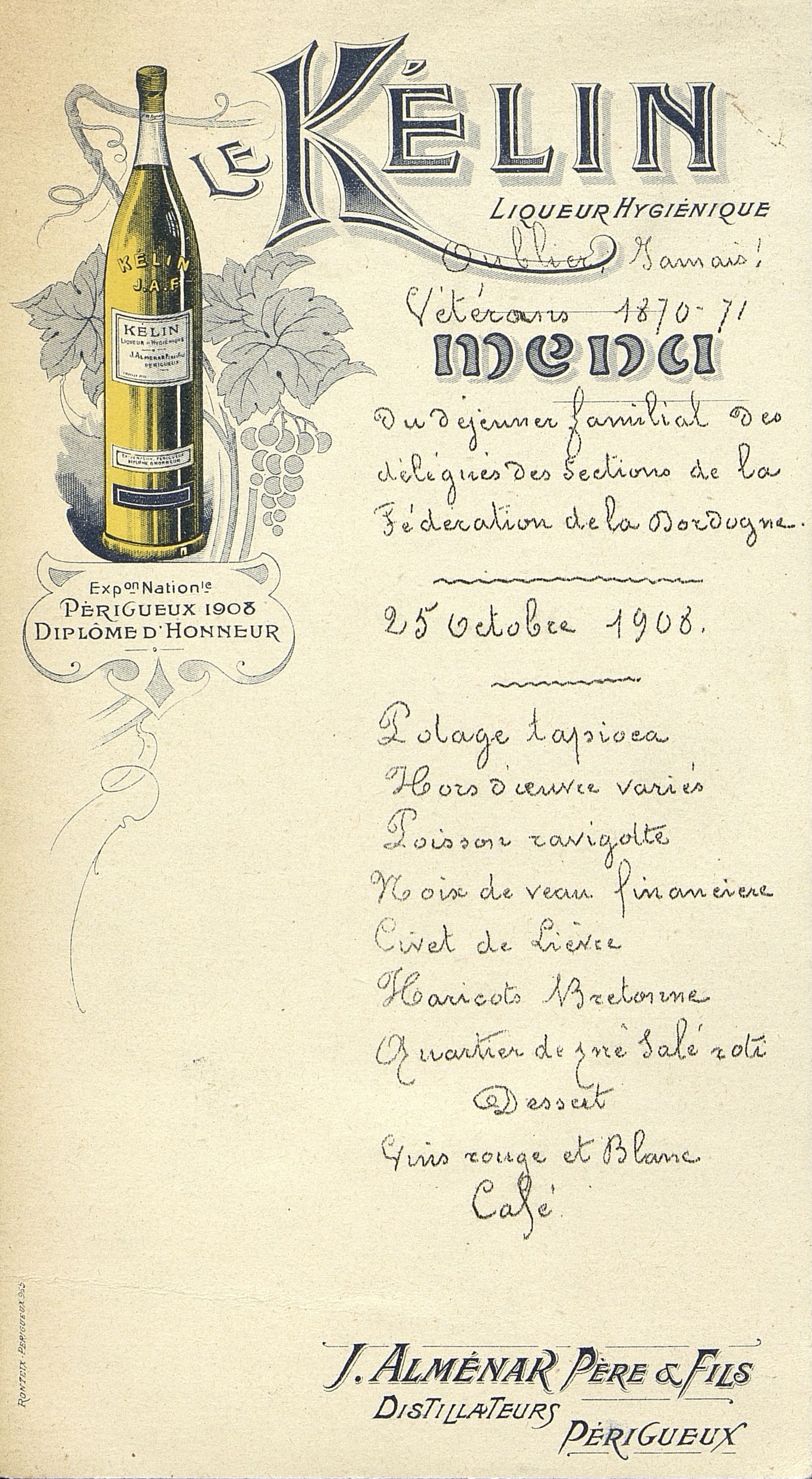 Illustration : Publicité commerciale pour la liqueur hygiénique Le Kélin de J. Alménar Père et Fils Distillateurs à Périgueux. Exposition nationale. Périgueux 1908. Diplôme d'honneur.