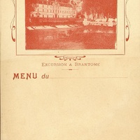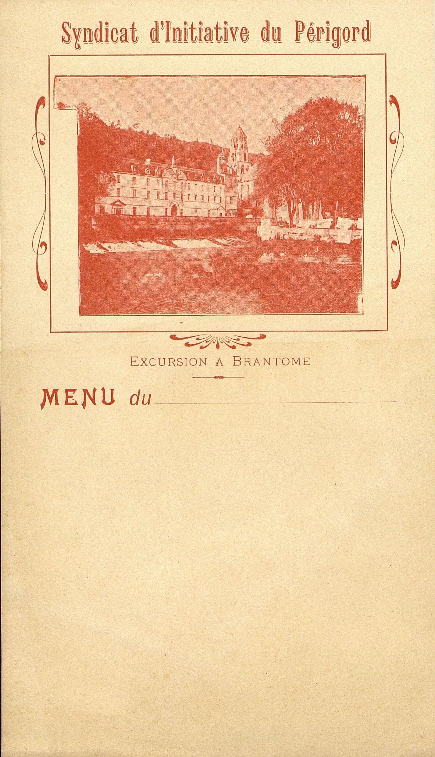 - Menu à l'en-tête du Syndicat d'Initiative du Périgord avec une reproduction d'image intitulée : Excursion à Brantôme.
