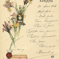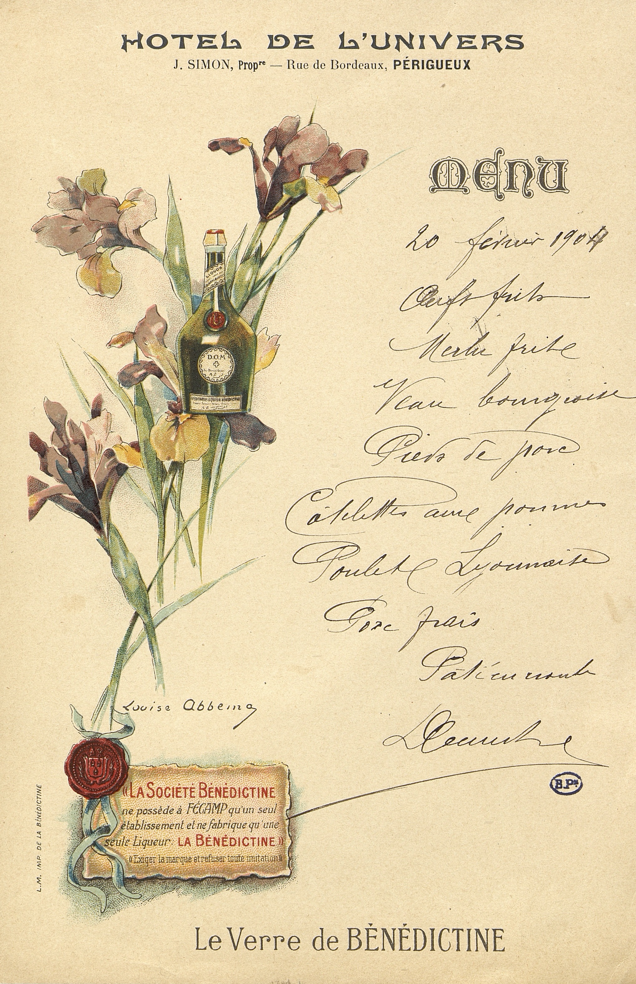 Menu publicitaire La Bénédictine. Manuscrit . Collection des fleurs. Iris .