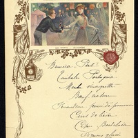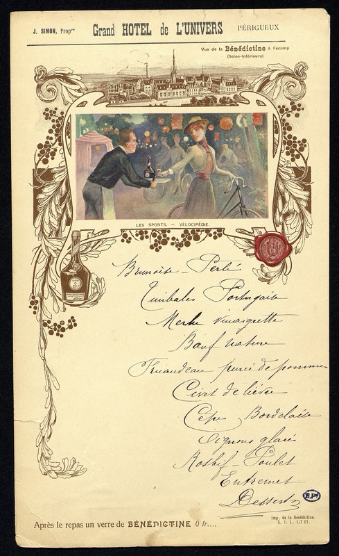 Menu publicitaire sur le thème des sports : Vélocipédie, texte manuscrit. Publicité pour la Bénédictine. S.I.L. 1/7 01.