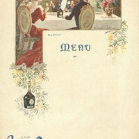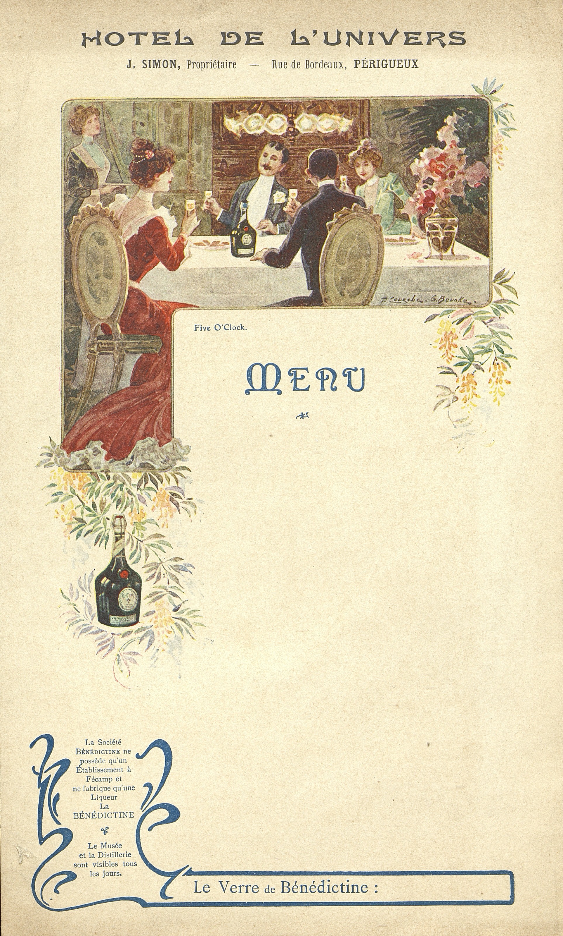 Menu vierge en couleur du Grand Hôtel de l'Univers. Illustration : thème du Five O'clock. publicité commerciale pour la Bénédictine.