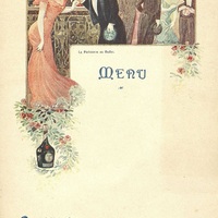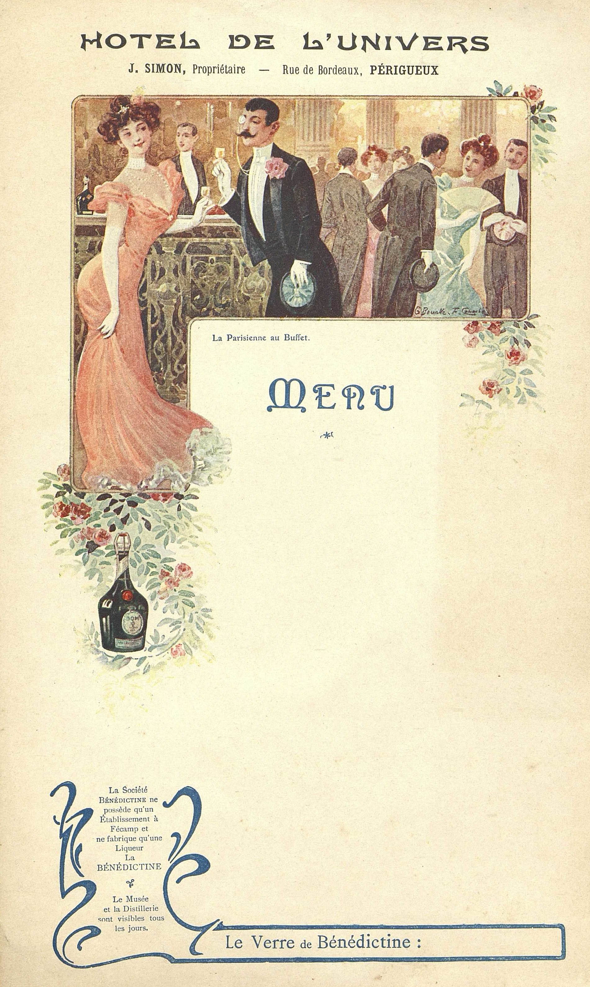Menu vierge en couleur, thème de La Parisienne au Buffet. Publicité commerciale "La Bénédictine".