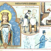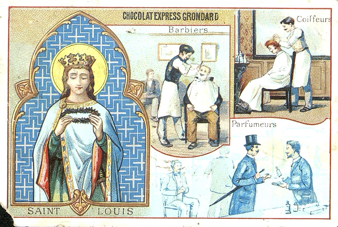 Carte publicitaire. Chromolithographie. Saint-Louis et les métiers. Vignette commerciale.