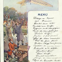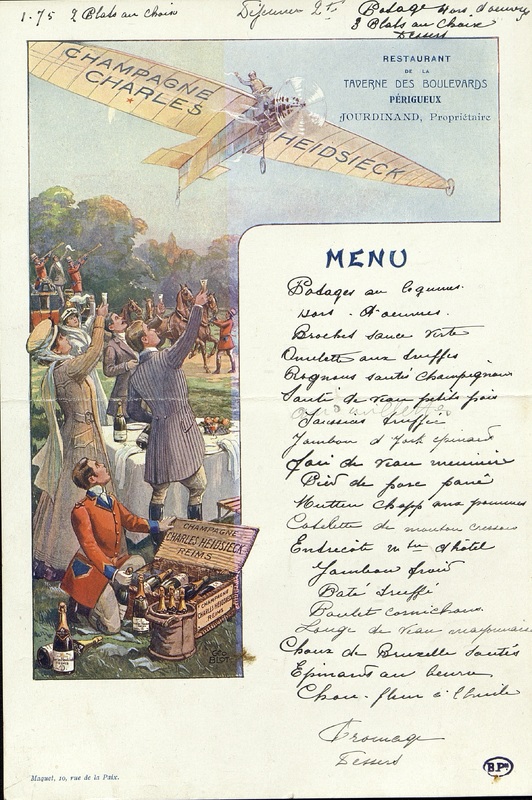 Menu publicitaire en couleur pour les champagnes Heidsieck. Toast au champagne sous le vol d'un avion publicitaire de la marque. Menu manuscrit.