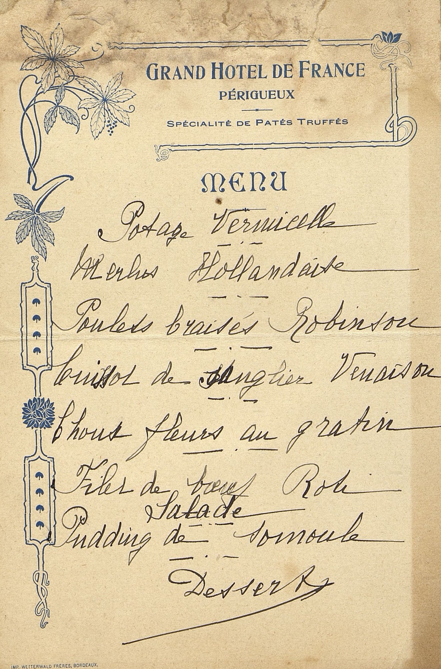Plats servis : Potage vermicelle. Merlus Hollandaise. Poulets braisés Robinson. Cuissot de sanglier Venaison. Choux-fleurs au gratin. Filet de bœuf rôti. Salade. Pudding de semoule. Dessert.