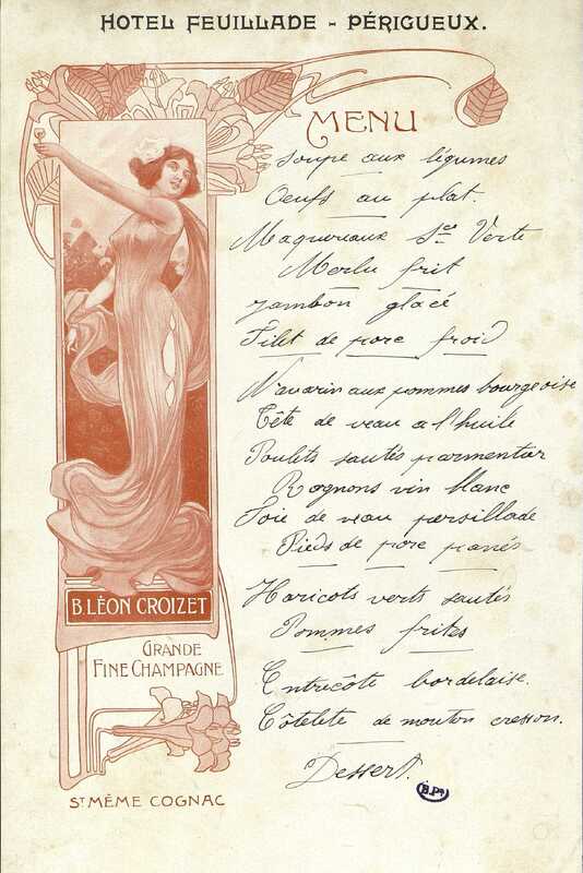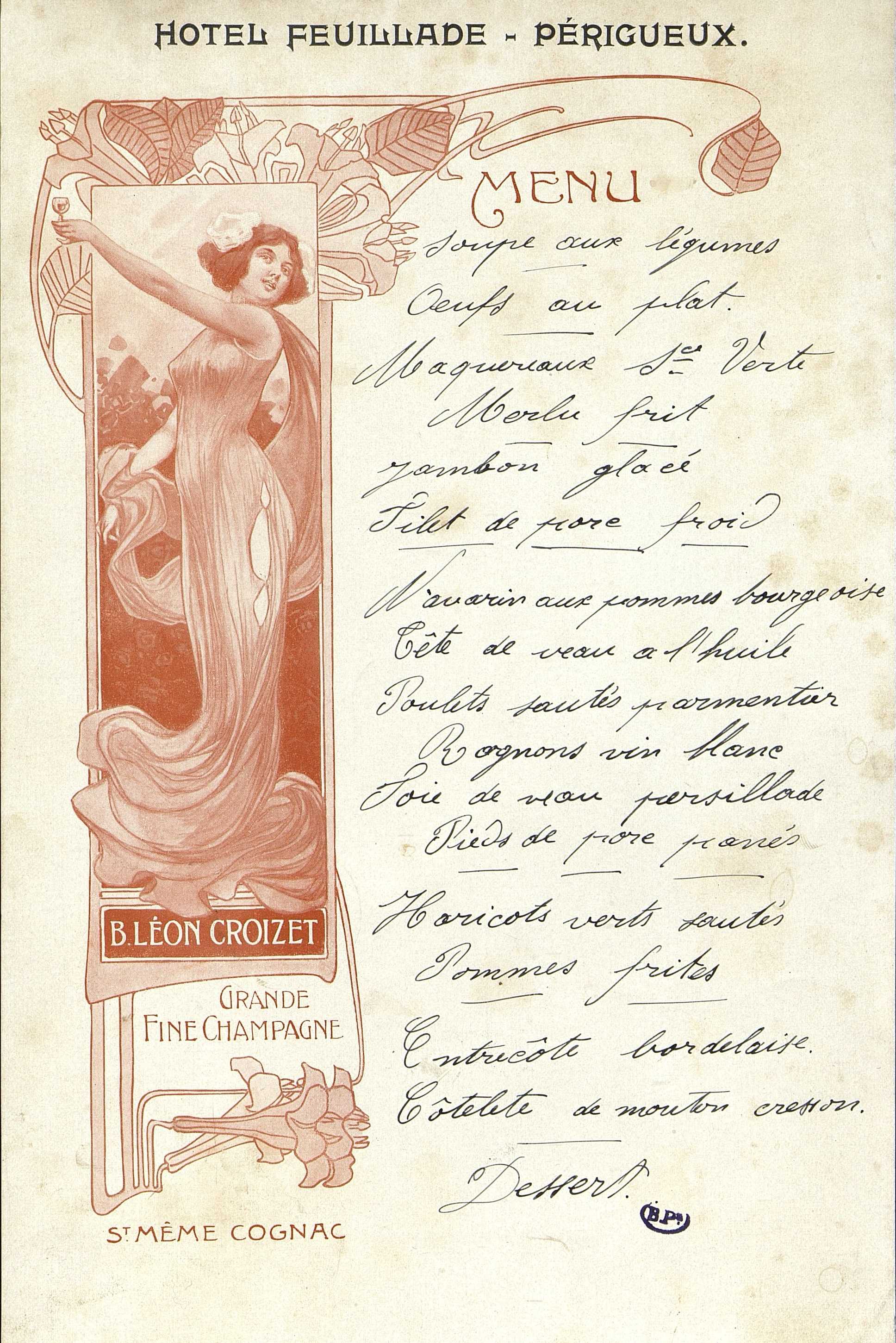 Menu publicitaire manuscrit à l'encre. Hôtel Feuillade à Périgueux.