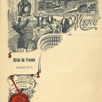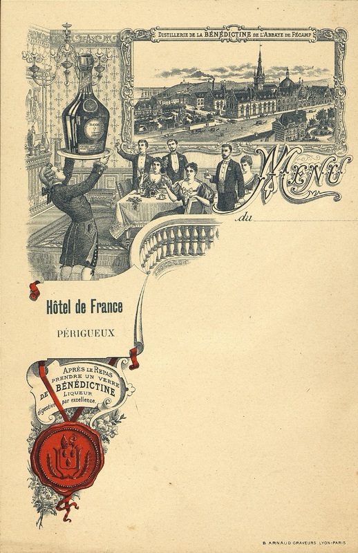 Menu vierge illustré de l'hôtel de France à Périgueux, avec une publicité pour la liqueur Bénédictine.