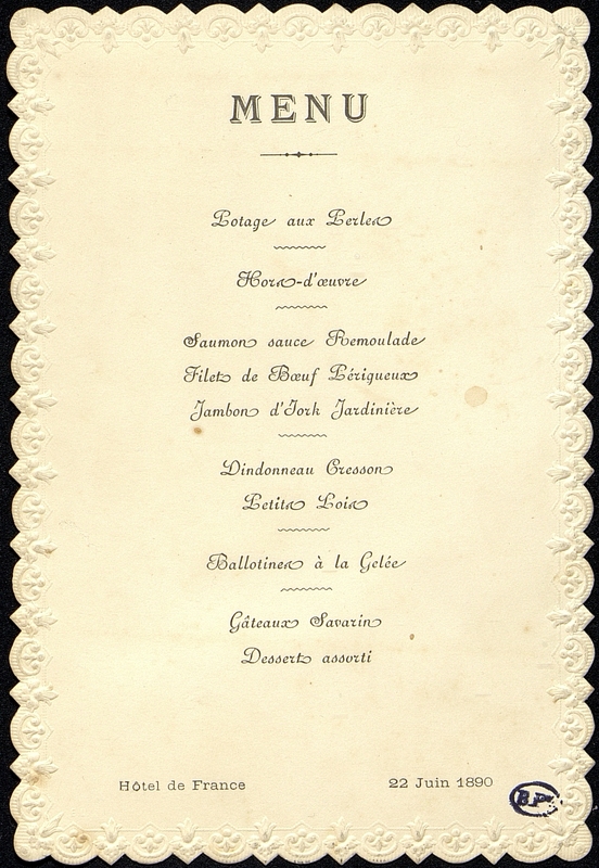 Menu dentelé et imprimé portant au dos le nom de Dujarric-Descombes et daté du 22 juin 1890. Festonnage fleuri.