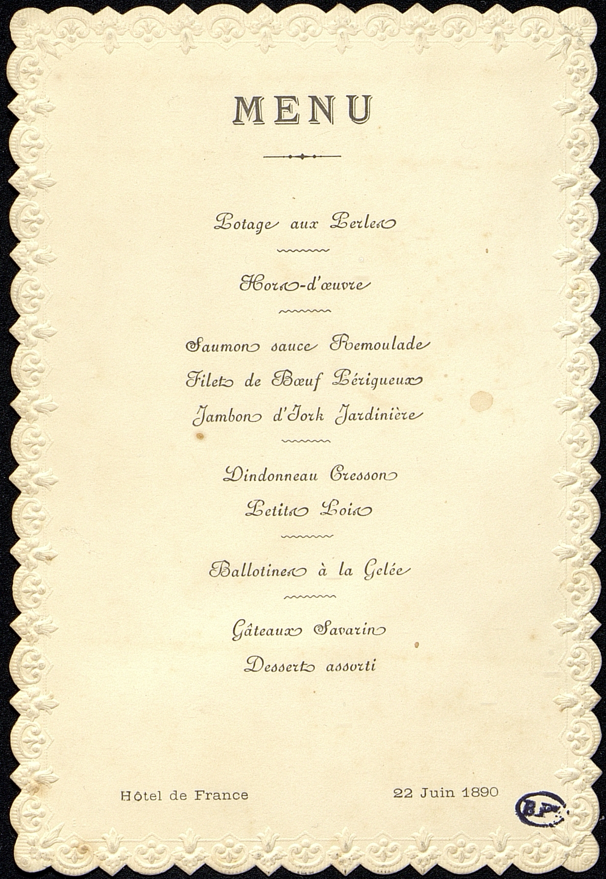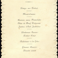 Plats servis : Potage aux perles. Hors d’œuvre. Saumon sauce Rémoulade. Filet de Bœuf Périgueux. Jambon d' York Jardinière. Dindonneau Cresson. Petits Pois. Ballotine à la Gelée. Gâteaux Savarin. Dessert assorti.