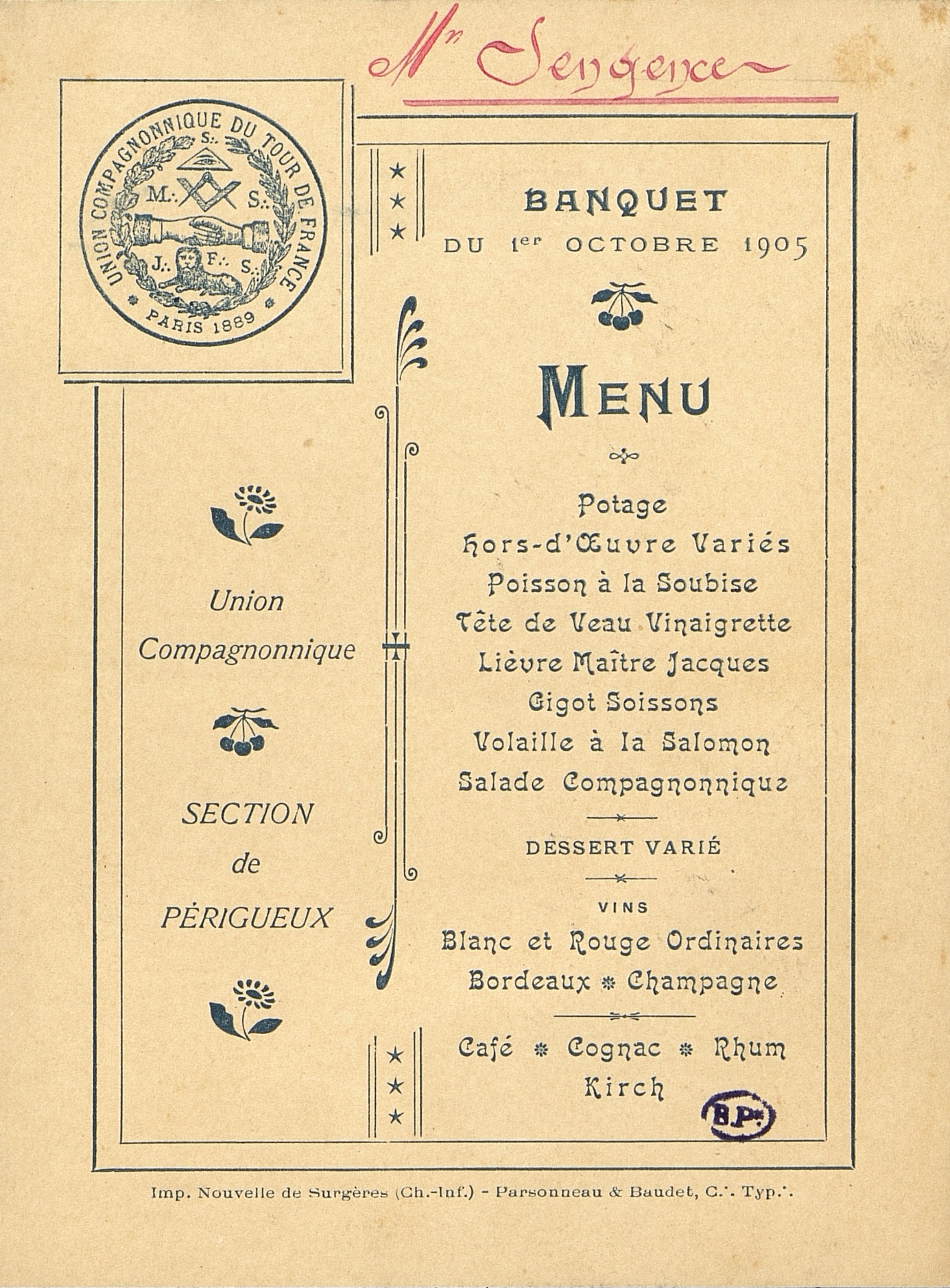 Plats servis : Potage. Hors d’œuvres variés. Poisson à la Soubise. Tête de veau Vinaigrette. Lièvre Maître Jacques. Gigot Soissons. Volaille à la Salomon. Salade Compagnonnique. Dessert varié.