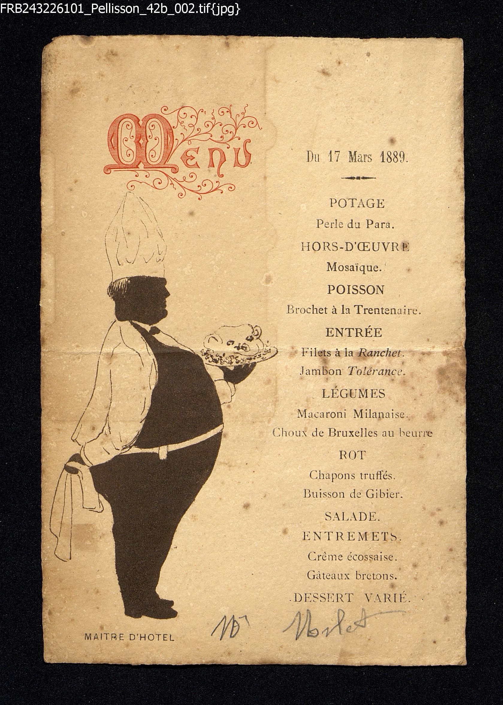 Menu adressé à M. Morlet, écrit en manuscrit. Illustré par un profil de Maitre d'hôtel portant un plat. Menu maçonnique.
