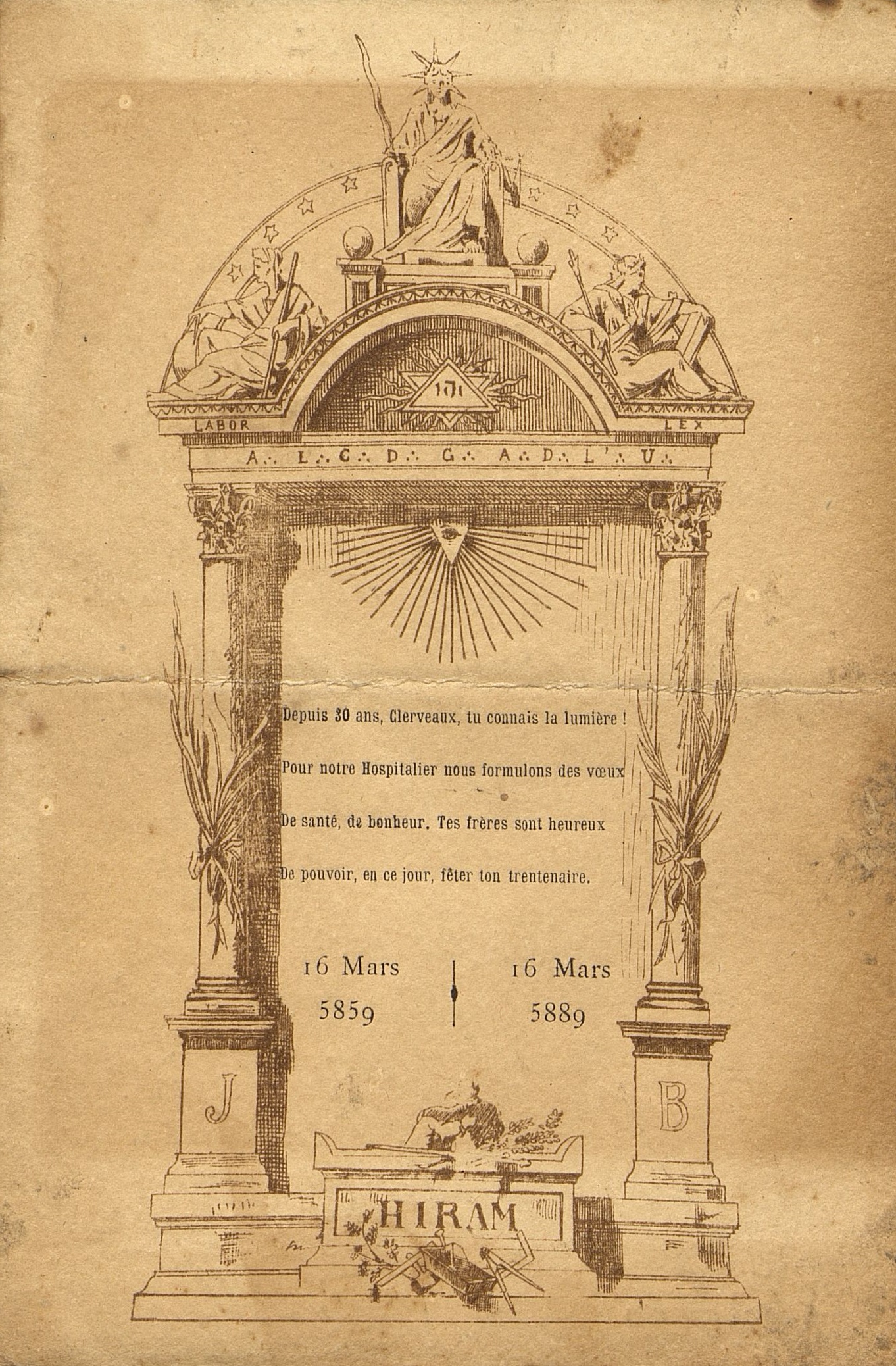 Frontispice dédicatoire de la loge maçonnique de Clerveaux. Symboles maçonniques. HIRAM. Datation normale et maçonnique.