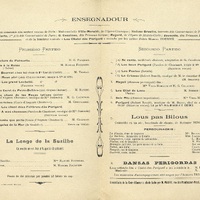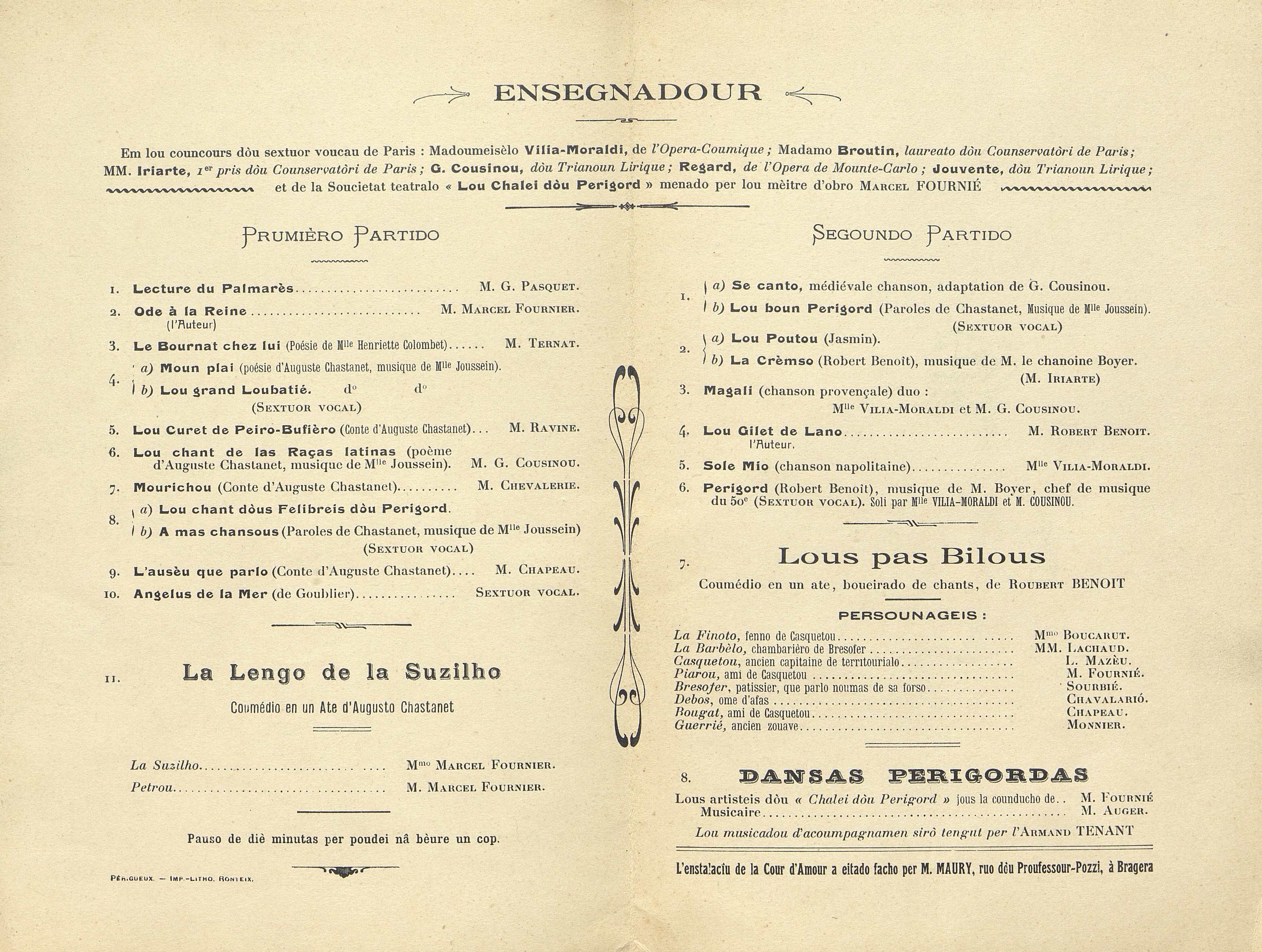 1. a) Se canto : chanson médiévale adaptée / G. Couzinou, adapt. 1. b) Lou boun Perigord / Auguste Chastanet, aut. ; Mlle Joussein, mus. ; Sextuor vocal. 2. a) Lou Poutou / Jasmin, aut. . 2. b) La Crèmso / Robert Benoît, aut. ; M. le chanoine Boyer, mus. / M. Iriate, chant . 3. Magali : chanson provençale : duo / Mlle Vilia-Moraldi , G. Couzinou, chant. 4. Lou Gilet de Lano = le gilet de laine / Robert Benoit, aut. . 5. Sole Mio : chanson napolitaine / Mlle Vilia-Moraldi, chant. 6. Perigord / Robert Benoît, aut. ; Boyer, mus. ; Sextuor vocal, Mlle Villa-Moraldi, M. Cousinou, chant. 7. Lous pas bilous = Le pas bileux : coumédio en un ate, boueirado de chants = comédie en un acte, florilège de chants / Robert Benoit. [interpr. par] Mme Boucarut (La Finoto, fenno de Casquetou = épouse de Casquette) , MM. Lachaud (La Barbèlo, chambariéro de Besofer = chambrière de Besofer), L. Mazèu ou Mazeau (Casquetou, ancien captaine de territourialo = ancien capitaine du territoire), M. Fournié (Piarou, ami de Casquetou), Sourbier (Besofer, patissier que parlo noumas de sa forso = qui ne parle que de sa force). Chavalorio (Debos, omos d'afas = homme d'affaires), Chapeau (Rougat, ami des Casquetou), Monnier (Guerrié, ancien zouave) . 8. Dansas perigodas = Danses périgourdines : Lous artisteis dou "Chalei dou Perigord" jous la counducho de musicaire (M Fournié et Auger) . Lou musicadou d'acounpagnamen siro tengut per l'Armand Tenant = Les artistes du "Chalei dou Perigord" sont sous la direction de MM. Fournier et Auger, musiciens. L'enstalaciu de la Cour d'Amour a eitado facho per M. Maury, Rue dou Proufessour-Pozzi, à Brageira = La mise en place de la cour d'amour est organisée par M Maury de Bergerac.