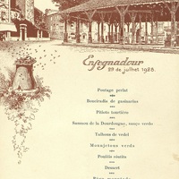 Saumou de la Dourdougno, sauço verdo = Saumon de la Dordogne sauce verte. Talhous de vedel = Talon de rouelle de veau. Moujetous verds = Haricots verts. Pouleis routits = Poulet rôti.